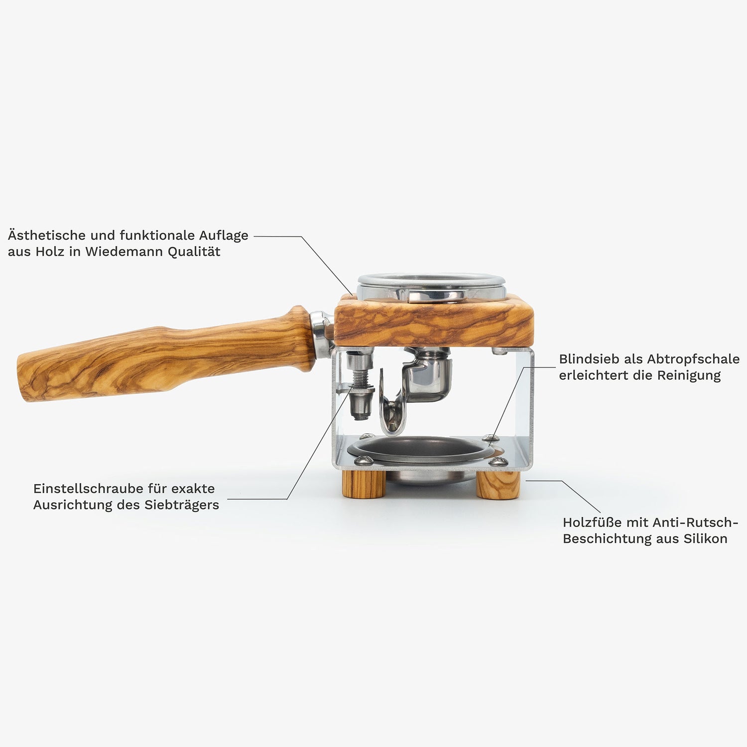 - Verstellschraube für exakt waagrechte Ausrichtung des Siebträgers